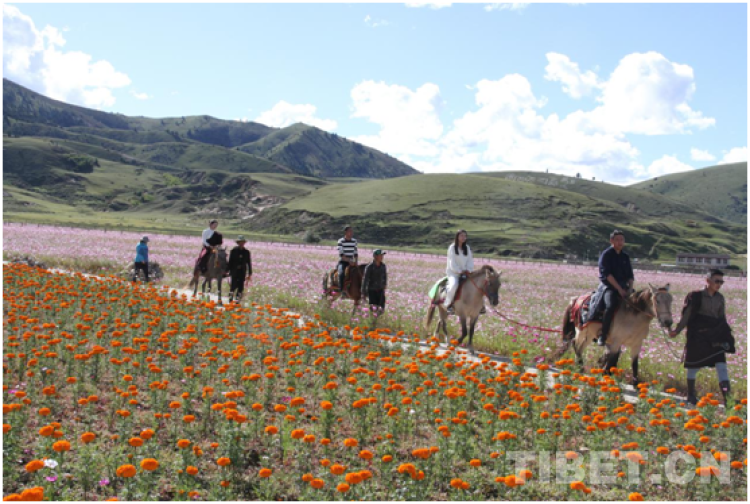 從理塘縣前往稻城亞丁機場方向60多公里,翻過一座小山坡,一片如夢似幻的花海景觀瞬間映入眼簾。曾經(jīng)名不見經(jīng)傳的小山村——濯桑鄉(xiāng)漢戈村已實現(xiàn)“沙化地”到“花海”的蛻變,成為新的網(wǎng)紅打卡點。在花團錦簇間拍照、在草原上騎馬,或者到旁邊康藏陽光種植基地采摘“極地果蔬”、購買農(nóng)民合作社的原生態(tài)農(nóng)副產(chǎn)品……游客可盡興體驗。