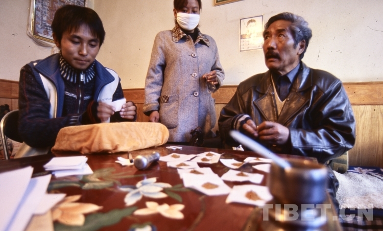 第二天早上9點(diǎn),我來(lái)到了市婦幼保健院附近他的診所,長(zhǎng)長(zhǎng)的隊(duì)伍一直從小屋排到了外面幾十米,從病人的穿著看,有拉薩本地人,也有許多外地人,還有不少是遠(yuǎn)道而來(lái)的牧民。我想給旦增醫(yī)生拍些工作照,于是直接進(jìn)了診所。這個(gè)診所是一個(gè)很小很簡(jiǎn)單的套間,旦增醫(yī)生在外面診病,他的兩個(gè)徒弟在里面配藥。多年來(lái),他堅(jiān)持義診,只收取一點(diǎn)制藥的成本錢(qián)。