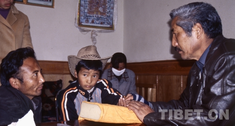 夫人給我們把酥油茶倒上,喝過(guò)幾口,旦增醫(yī)生開(kāi)始給我診脈。雙眉微蹙,凝神靜氣,我大氣也不敢出。目光移到他手上戴著的半截指手套,覺(jué)得很親切,我因?yàn)楣ぷ髦幸獙?xiě)作和拍攝,所以我也喜歡戴半截指手套,而且當(dāng)時(shí)我和旦增醫(yī)生戴的是同款。后來(lái)我見(jiàn)過(guò)他多次,不管什么季節(jié),他總戴著半截指手套,才發(fā)現(xiàn)另有原因,這是后話。