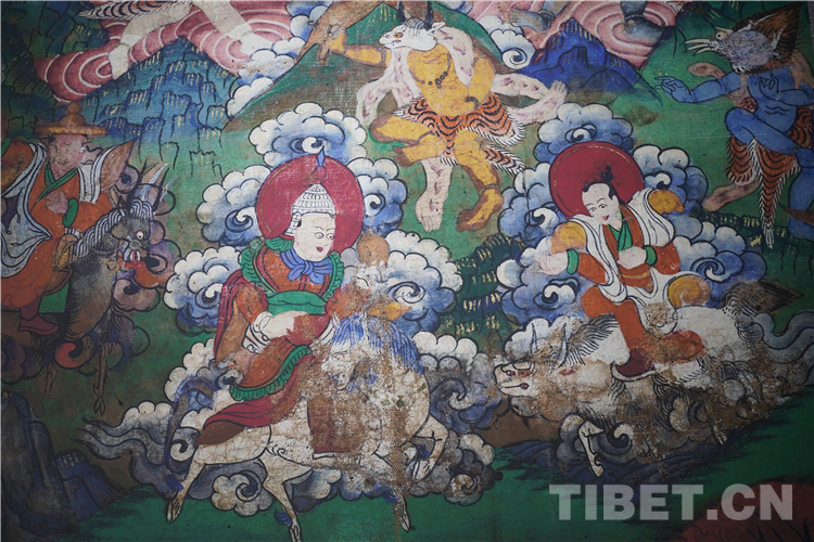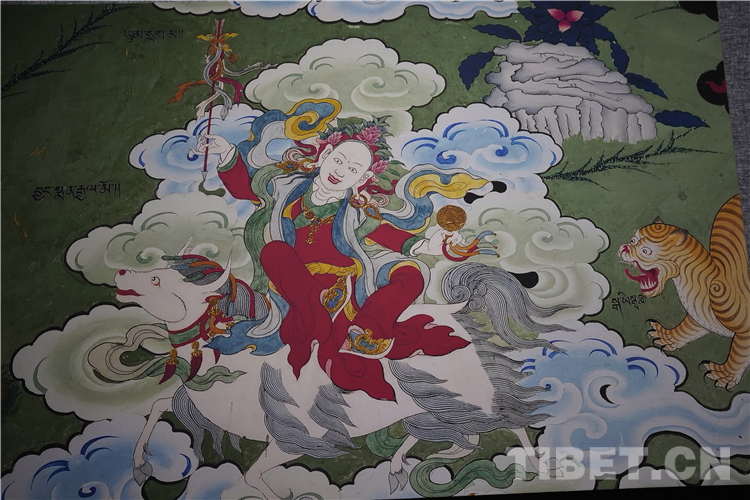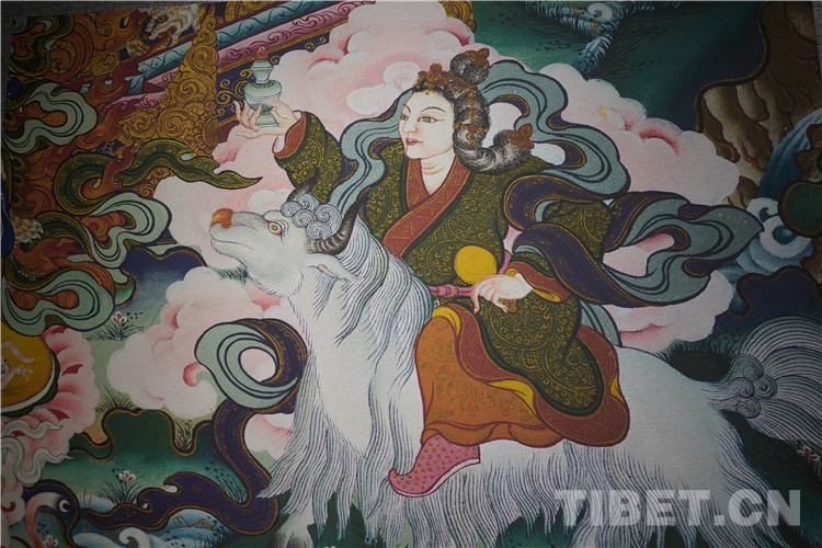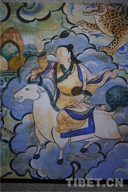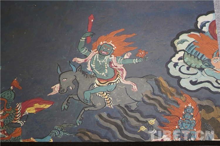 展廳中還有一副遠(yuǎn)看非常另類(lèi),細(xì)細(xì)欣賞漢藏繪畫(huà)風(fēng)格交流交融的作品,那是一幅四川省阿壩藏族羌族自治州金川縣墨爾多神山壁畫(huà)的局部作品。東智先生說(shuō):“這幅局部畫(huà)作從發(fā)髻、服飾等多個(gè)方面充滿了漢族風(fēng)格,甚至人物穿的還是漢服,座下是像馬一樣的牦牛,但是手上掄著古朵(古朵指的是用牦牛毛或者山羊毛編織成的拋石繩,可以將石頭投擲到較遠(yuǎn)的地方,是牧民們用來(lái)放牧的工具),非常有辨識(shí)度,充滿藏族文化特色?!?/p>