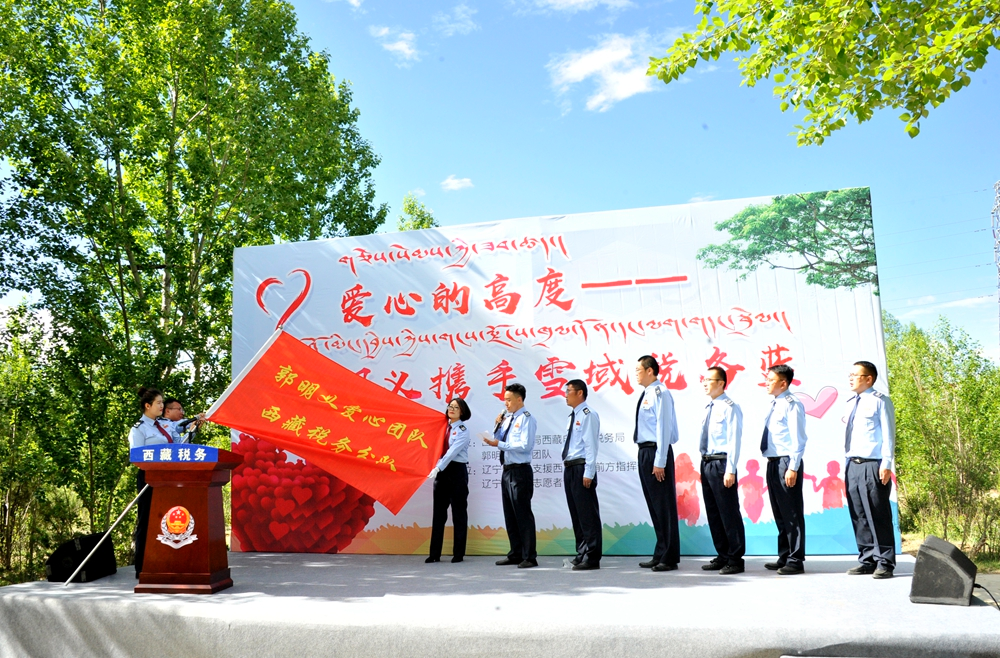 接過“郭明義愛心團隊西藏稅務(wù)分隊”的大旗,一組青年稅務(wù)干部登臺宣誓。稅務(wù)干部次仁頓珠說,加入郭明義愛心團隊既光榮,又是一份沉甸甸的責任,要將這份愛心傳承好、發(fā)揚好,用心、用情投入公益事業(yè),在決戰(zhàn)脫貧攻堅、決勝全面小康的舞臺上展示稅務(wù)藍、貢獻稅務(wù)力量。