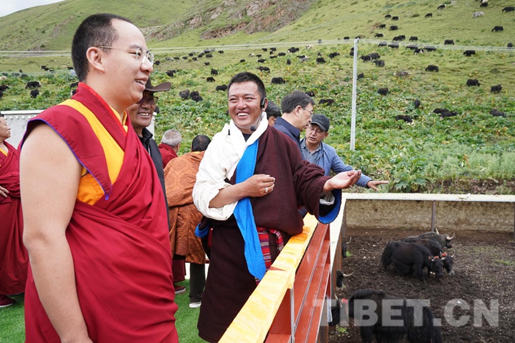 在調研中,十一世班禪關心的問題得到了很好的解答,他頻頻點頭表示贊許。從娘亞牦牛原種場了解到養(yǎng)殖基地的建成運營情況后,十一世班禪立刻趕往公司加工車間和銷售店,觀摩酥油、奶制品制作過程,了解銷售、帶動牧民增收情況。十一世班禪希望公司能夠將嘉黎的自然氣候、土地條件等實際情況與科學實驗相結合,樹立好家鄉(xiāng)民族特色品牌,為草原生態(tài)保護和畜牧業(yè)發(fā)展探索經驗。