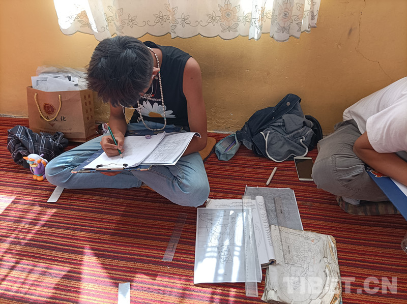 圖為仁俊熱貢藝術(shù)學(xué)院的學(xué)徒在練習(xí)畫唐卡線條