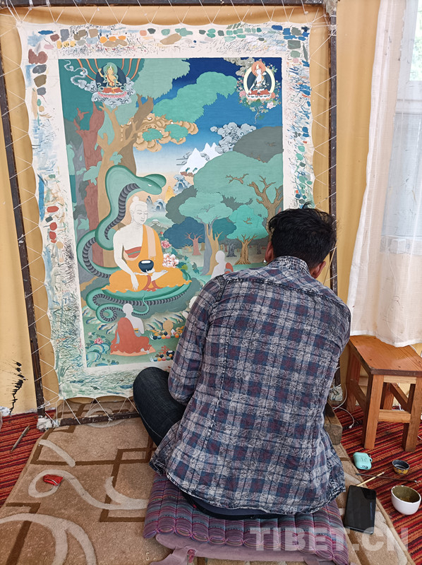 圖為仁俊熱貢藝術(shù)學(xué)院的學(xué)徒在繪制唐卡