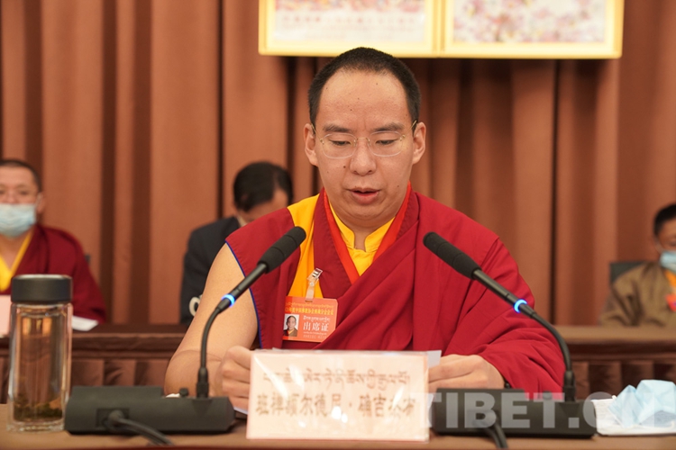 圖為十一世班禪在會(huì)上作工作報(bào)告 攝影:王淑
