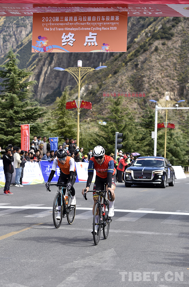 圖為2020第三屆跨喜馬拉雅自行車(chē)極限賽公路自行車(chē)賽第一段男子組參賽選手抵達(dá)終點(diǎn) 攝影:王媛媛