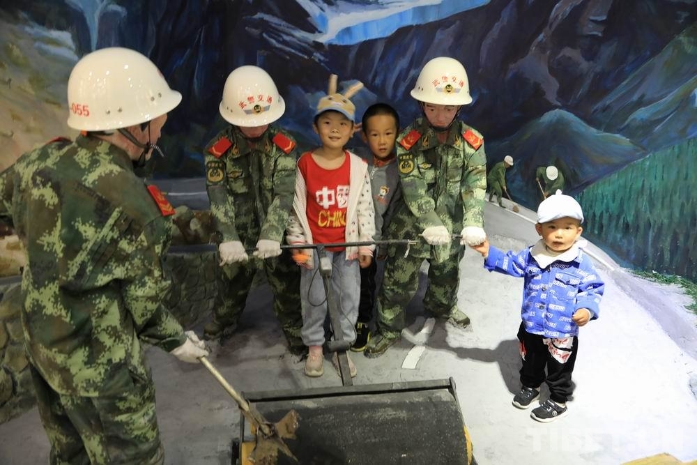 圖為軍娃與官兵養(yǎng)護道路模型合影 攝影:陸文凱
