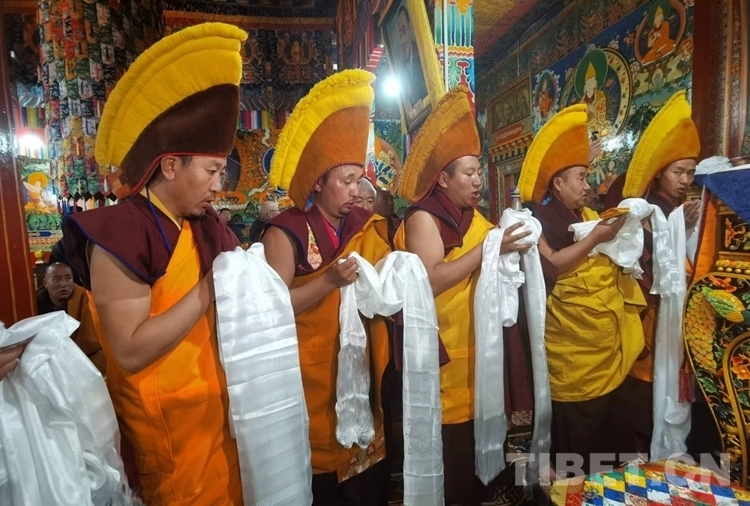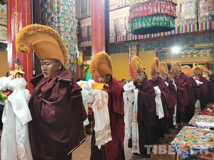 當(dāng)日的拉定寺裝飾一新,班禪一行抵達后,現(xiàn)場法號齊鳴、法螺合奏,倫珠晉巴和僧眾在寺廟前舉行了隆重的歡迎儀式。隨后,在手持香爐、寶傘高僧的引導(dǎo)護送下,班禪步入主殿上寶座,向寺廟僧眾傳授《三主要道論》,為僧眾摸頂賜福、發(fā)放布施。