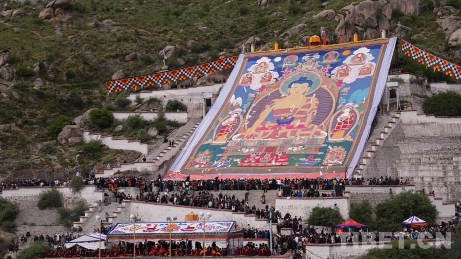 中國(guó)西藏網(wǎng)訊 8月4日,哲蚌寺背后的半山腰上,伴著莊嚴(yán)的法號(hào)聲,巨幅釋迦牟尼像唐卡緩緩展開,吸引著數(shù)以千計(jì)的信教群眾和來自世界各地的游客,場(chǎng)面蔚為壯觀。
