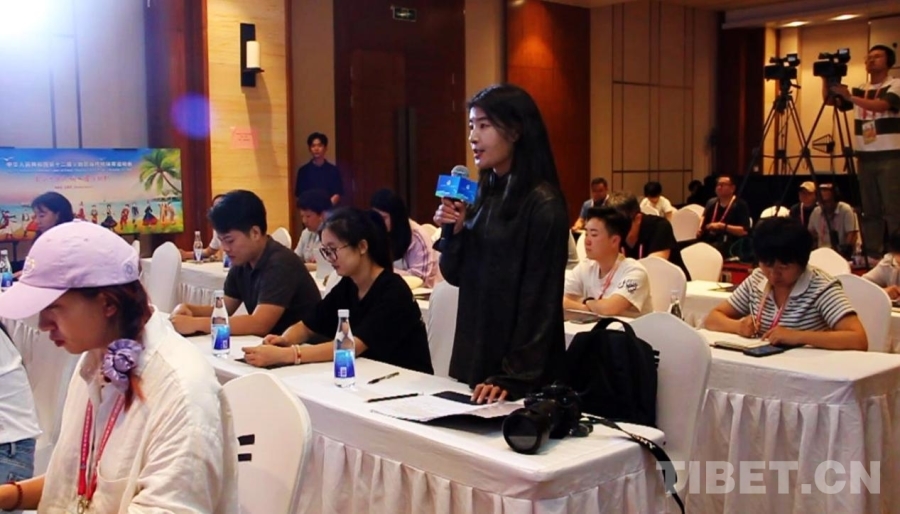 圖為中國西藏網(wǎng)記者在第十二屆全國少數(shù)民族傳統(tǒng)體育運(yùn)動(dòng)會(huì)黑龍江、福建、西藏代表團(tuán)新聞發(fā)布會(huì)上提問 攝影:劉莉