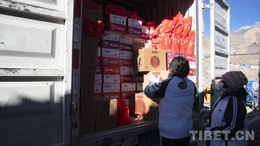 圖為西藏當雄姆蘭農業(yè)科技發(fā)展農民專業(yè)合作社在嘎旦村受災安置點發(fā)放物資 攝影:趙振宇