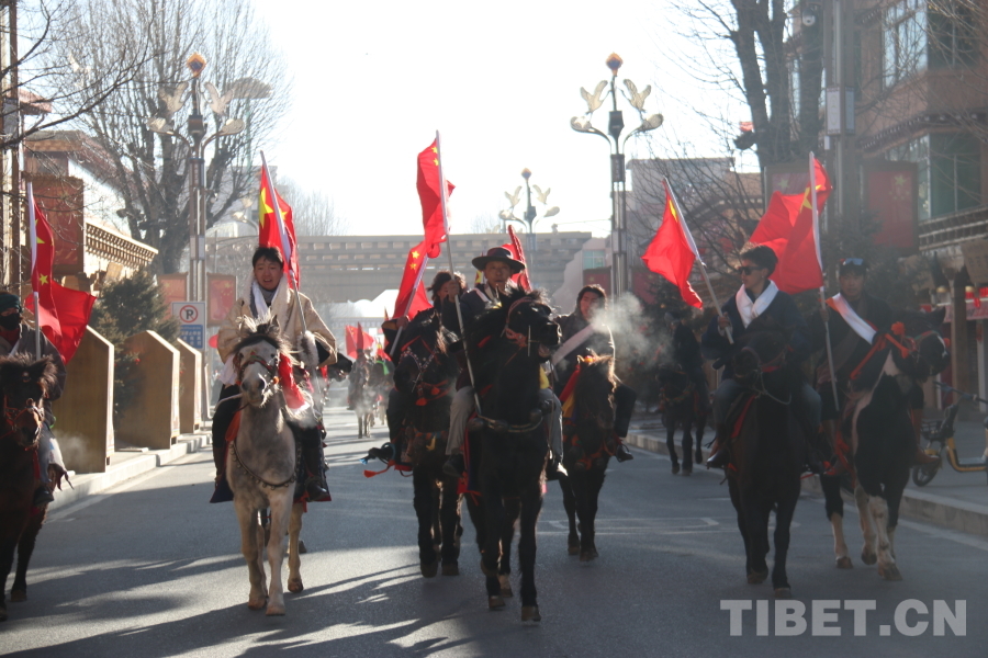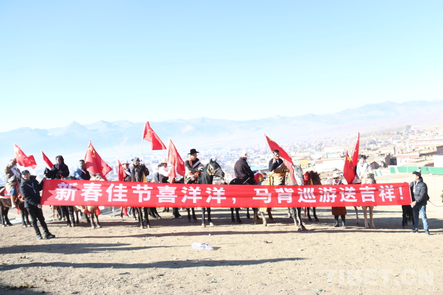 馬術巡游隊伍來到理塘東山頂上,俯瞰縣城全景,并展開祝福橫幅,用藏漢雙語高聲祝愿全國各族人民新春吉祥。