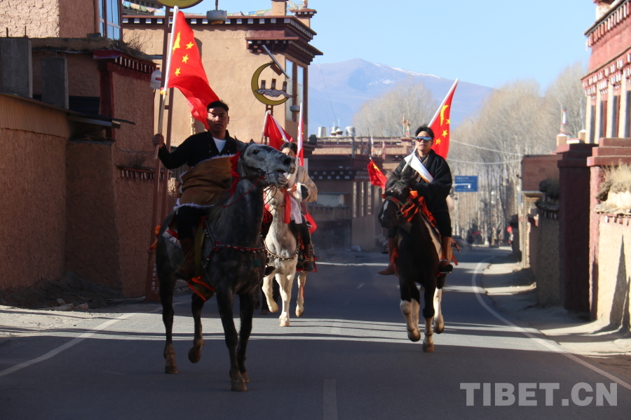 縣城新時代文明實踐廣場上擺放著“中華民族一家親,共度中國吉祥年”的藏式切瑪盒,馬術巡游隊伍繞行象征幸福安康的切瑪盒,祈愿風調(diào)雨順、五谷豐登,祝福祖國繁榮昌盛。