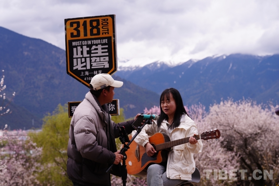 桃花樹下,沿著階梯往觀景臺方向走去,“此生必駕318”打卡路牌十分醒目,游客坐在一旁的座椅上拿起吉他,對著話筒深情歌唱,遠(yuǎn)處皚皚雪山與茂密的森林,近處粉白相間的桃花和金燦燦的油菜花構(gòu)成一幅壯美畫卷,讓游客沉醉在歌聲與美景中,苑寶錄正忙著將這一瞬間拍攝記錄。