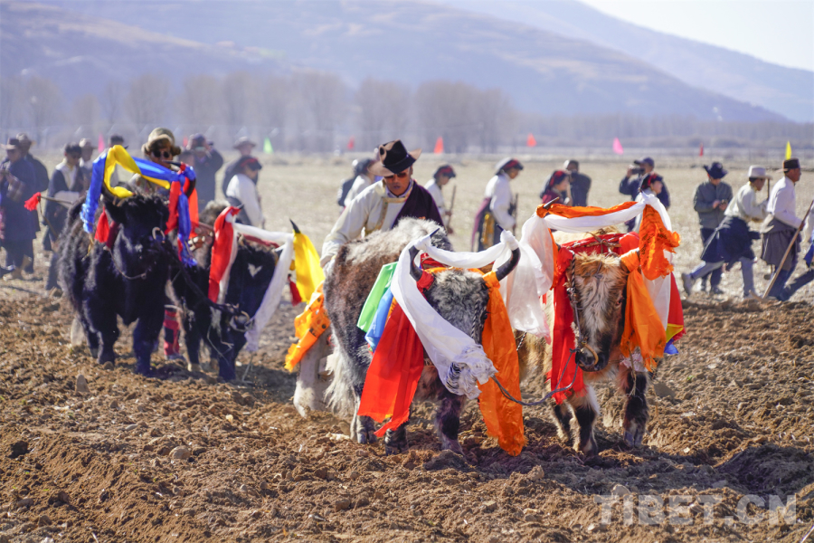 祈福儀式后,極具民族特色的二牛抬杠耕作表演精彩上演。來自三個片區(qū)的耕作者身著藏繡華服,用哈達裝飾耕牛,以傳統(tǒng)木犁翻土開壟,在雄渾的勞動號子中,勾勒出千年農耕文明的鮮活圖景。