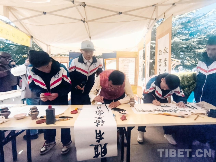圖為4月19日,第二屆“拉薩春日書會”宗角祿康公園主會場內(nèi),拉薩江蘇實驗中學(xué)書法社的同學(xué)們在撰寫書法作品 攝影:趙釗