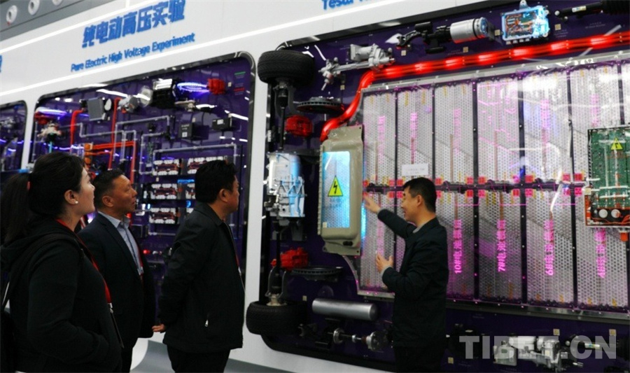 “這是由7104節(jié)電池組成的特斯拉的電池組,它是402伏的高壓電。所以,沒(méi)有經(jīng)過(guò)專(zhuān)業(yè)培訓(xùn)進(jìn)行電動(dòng)汽車(chē)維修會(huì)有一定的危險(xiǎn)性?!北狈絿?guó)際汽車(chē)教育展廳、車(chē)間負(fù)責(zé)人黨超為到訪的西藏自治區(qū)工商聯(lián)民營(yíng)企業(yè)家赴京學(xué)習(xí)參觀團(tuán)一行詳細(xì)介紹著墻上展示的電池組。大家聽(tīng)得津津有味。