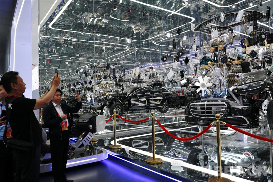 圖為西藏自治區(qū)工商聯(lián)民營(yíng)企業(yè)家赴京學(xué)習(xí)參觀團(tuán)一行在北方國(guó)際汽車(chē)教育拍攝奔馳整車(chē)吊裝爆炸式工業(yè)藝術(shù)展示 攝影:劉莉