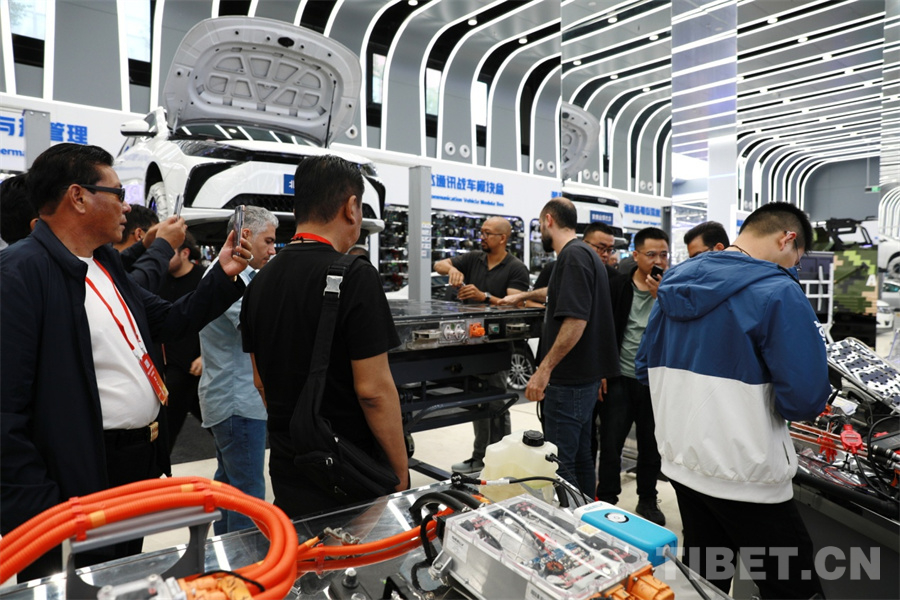 圖為觀摩來(lái)自伊朗、埃塞俄比亞等國(guó)家的學(xué)生實(shí)操新能源汽車(chē)電池組維修 攝影:劉莉