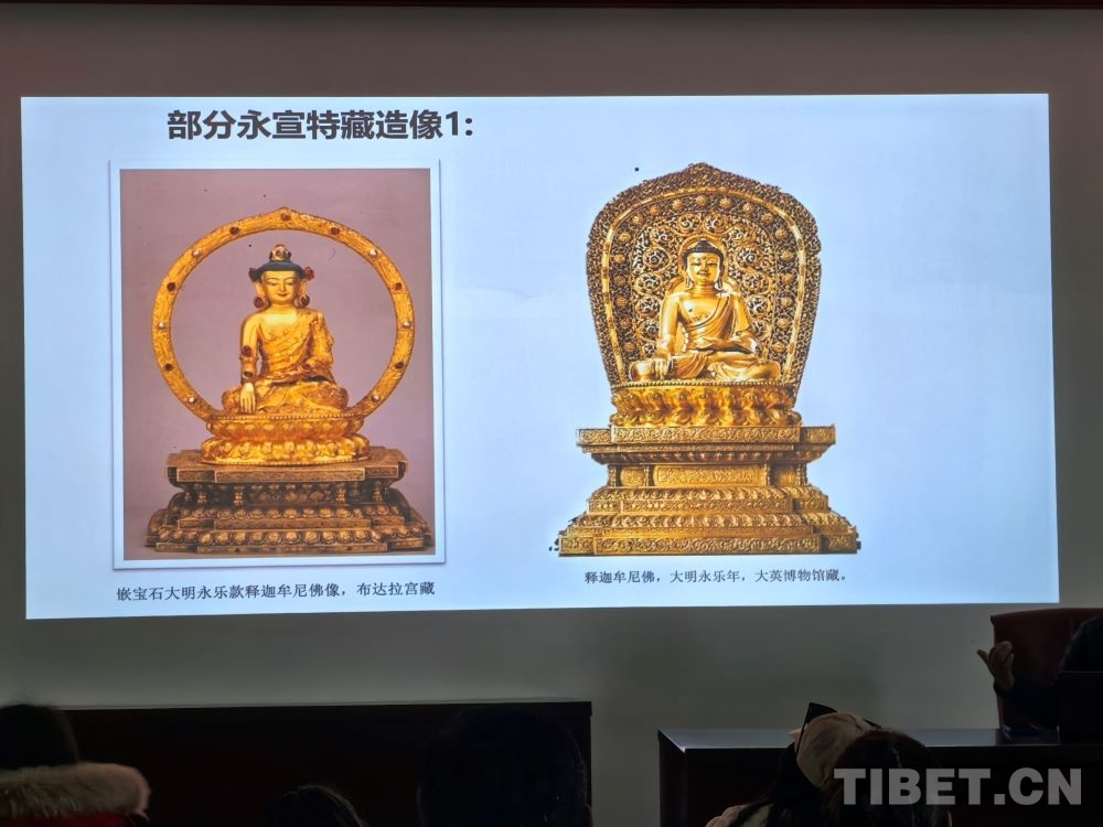 班旦次仁在講座中說,長期以來國內(nèi)外學(xué)者普遍認(rèn)為全球永宣造像共有300余尊。但在2013-2017年間的西藏可移動文物普查中,西藏共發(fā)現(xiàn)360尊永宣款造像,僅布達(dá)拉宮一處就發(fā)現(xiàn)了273尊,這些永宣造像自17世紀(jì)以來就一直供奉在布達(dá)拉宮各大殿堂,且鮮有人接近,為漢藏藝術(shù)交融研究提供了核心實物佐證。不僅如此,布達(dá)拉宮內(nèi)還有專門的“嘉納拉康”(漢地造像殿)來供奉這些佛像,布達(dá)拉宮收藏此類造像居世界之冠。