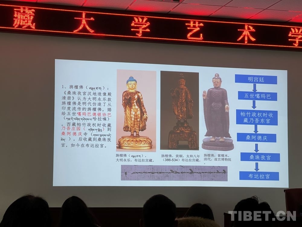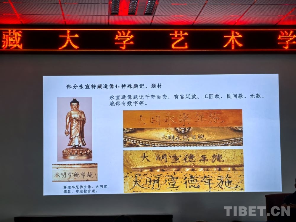 5月8日,在西藏大學(xué)藝術(shù)學(xué)院內(nèi),一場題為《布達(dá)拉宮館藏大明永宣款造像相關(guān)問題考察——兼談“漢地造像殿”的復(fù)原陳設(shè)研究》的講座吸引了眾多學(xué)術(shù)愛好者。布達(dá)拉宮文物管理處文物研究室班旦次仁老師以大量西藏大明永宣款造像為案例,向在場聽眾介紹了這一時期的佛像如何以媒介的形式增強(qiáng)各民族間的感情。