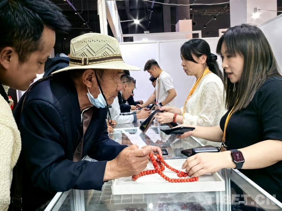 圖為5月16日第二屆拉薩進(jìn)口商品展覽會(huì)上,顧客在咨詢珊瑚飾品價(jià)格 攝影:王淑