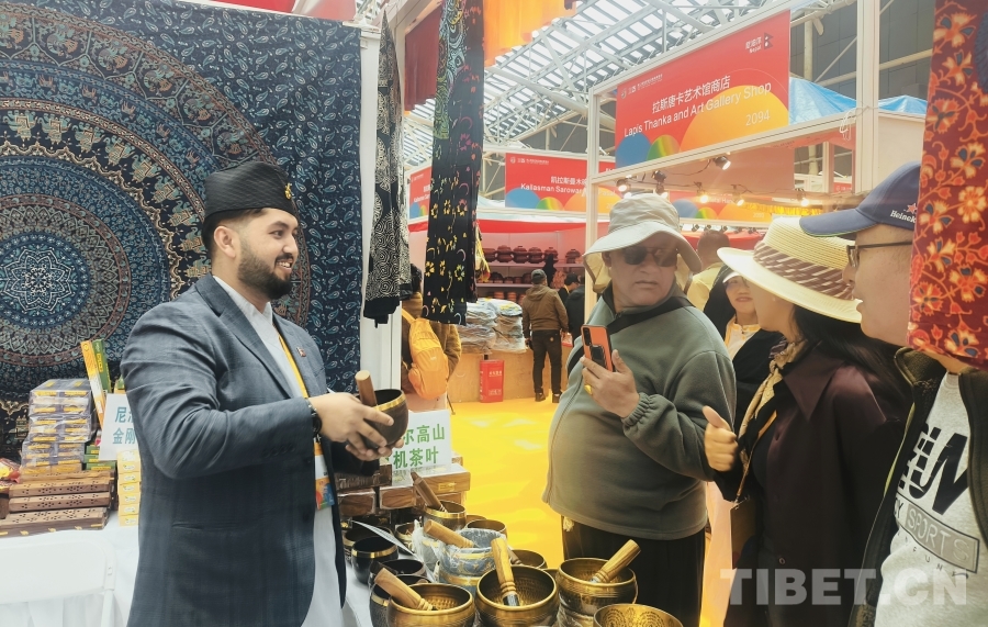 圖為5月16日,第二屆拉薩進(jìn)口商品展覽會(huì)上,尼泊爾商人向顧客演示如何敲擊頌缽 攝影:趙釗