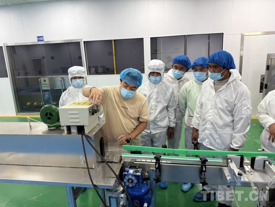 圖為生產(chǎn)車間里,巴桑旦增正專注調(diào)試設(shè)備,身旁同事們認真觀摩學(xué)習(xí)