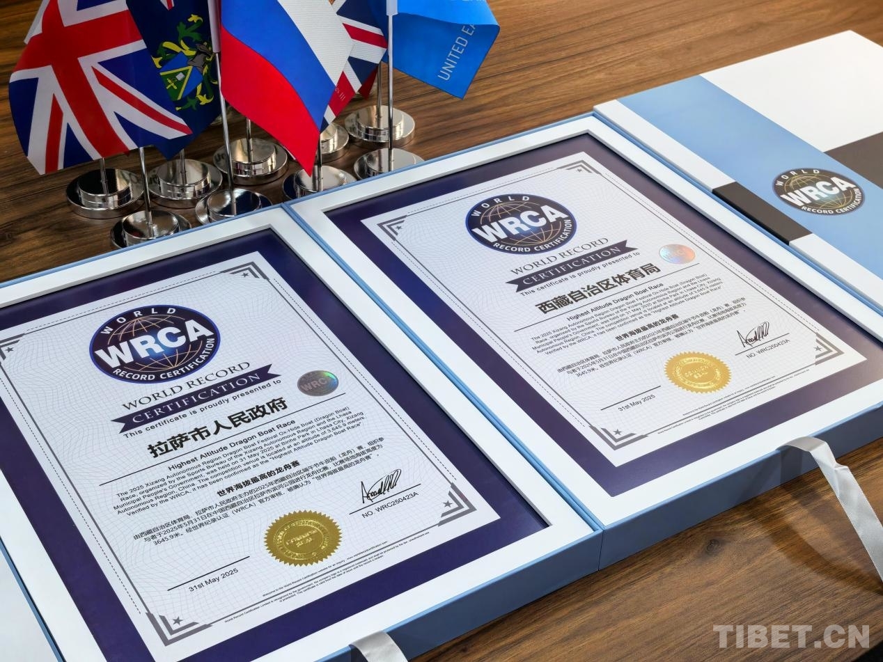 世界紀錄認證機構(gòu)(WRCA)認證官馬克先生發(fā)來賀電;WRCA中國區(qū)認證官王靜女士現(xiàn)場宣布了世界紀錄認證結(jié)果;WRCA中國區(qū)負責人、世界紀錄申報中心主任趙青太為西藏自治區(qū)體育局、拉薩市人民政府頒發(fā)了“世界海拔最高的龍舟賽”世界紀錄認證書。
