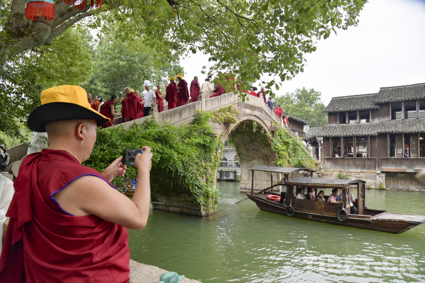 圖為在烏鎮(zhèn)西柵景區(qū)寒山拾得雕塑前西藏佛學院師生留下合影 攝影:趙振宇