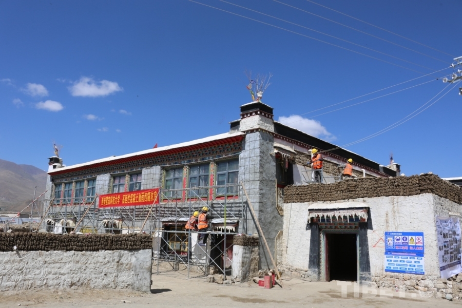 圖為日喀則市拉孜縣錫欽鄉(xiāng)崗西村,民房正在進(jìn)行維修加固