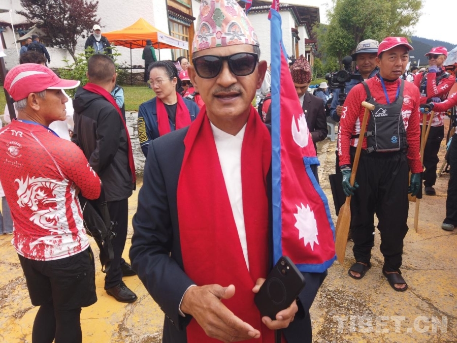 6月15日,“2025年西藏林芝南迦巴瓦高原體育大會(huì)——中尼高原龍舟友誼賽”在西藏林芝魯朗開(kāi)賽。圖為尼泊爾龍舟協(xié)會(huì)會(huì)長(zhǎng)錢(qián)德拉·波·達(dá)哈接受中國(guó)西藏網(wǎng)采訪 攝影:趙釗