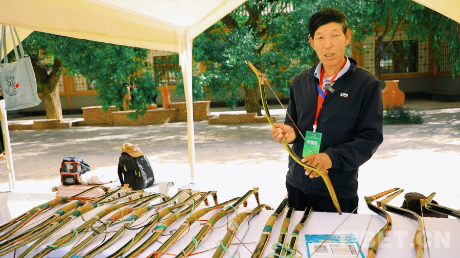 馬國財是一位來自青海省海東市樂都區(qū)的南山傳統(tǒng)牛角弓非遺傳承人,自曾祖父起他家在制作牛角弓方面的技藝是家喻戶曉的。他深受父輩的影響,做弓技藝更是嫻熟。此次活動,他帶來了自己的幾十張得意之作“南山傳統(tǒng)牛角弓”,在現(xiàn)場向?qū)ε=枪信d趣的游客耐心地講解選材、打磨、粘合、鋪筋、扎把、陰干、調(diào)試、加牛角、打磨、貼樺皮、上色等弓箭的制作過程,以及在生活當中的實際應用,讓更多的人了解到它不僅僅是一張普通的弓,更是祖祖輩輩的智慧結(jié)晶和珍貴非遺。
