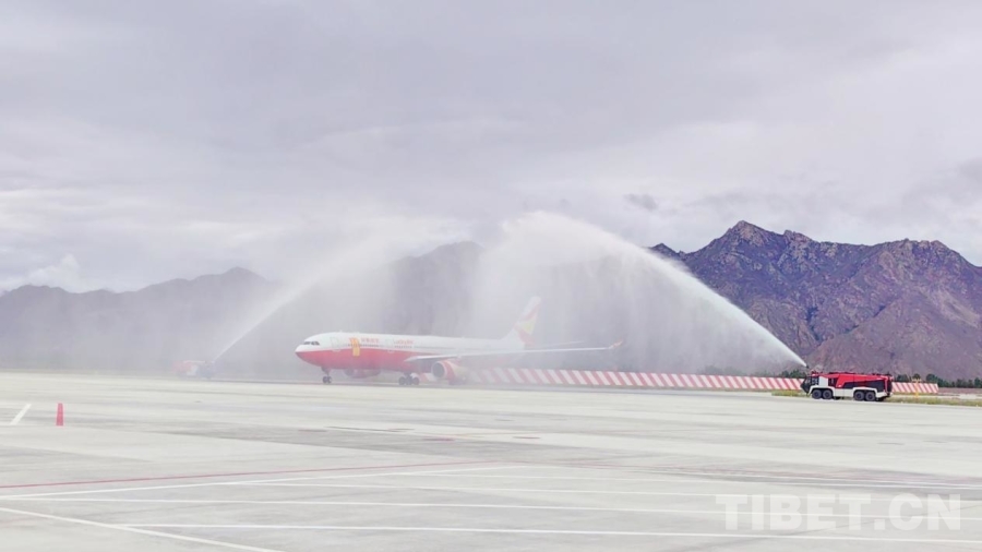 圖為8L9669航班在拉薩貢嘎國際機(jī)場(chǎng)穿過“水門”