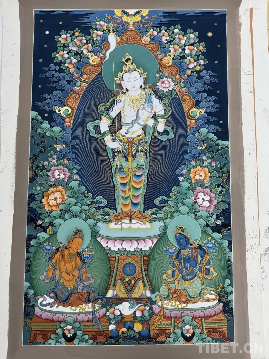 圖為展出的唐卡藝術家夏魯旺堆繪制的《水月觀音》唐卡作品
