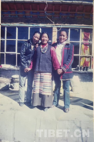 這是在我們家老房子門口照的。那時候全是土坯房,這間是四間房里最大的。大概是1990年左右。記得穿的這身衣服那些年很多人都穿,應該是軍裝,穿著這衣服騎馬去挖藥很多次。人民公社時期我們有八個生產(chǎn)隊,那時候要采藥掙工分,偶爾拉薩藏醫(yī)院的老師們會專程來札達,我們也要幫忙去采藥。這邊藥材很多,如雪蓮花、黃連、蒂丁等。拍這張照片時孩子的鞋和幾件衣服是我自己織的,但要買好衣服還得去阿里地區(qū)。那時我丈夫已經(jīng)在開車,我們家條件稍好些,但也不是村里最好的。