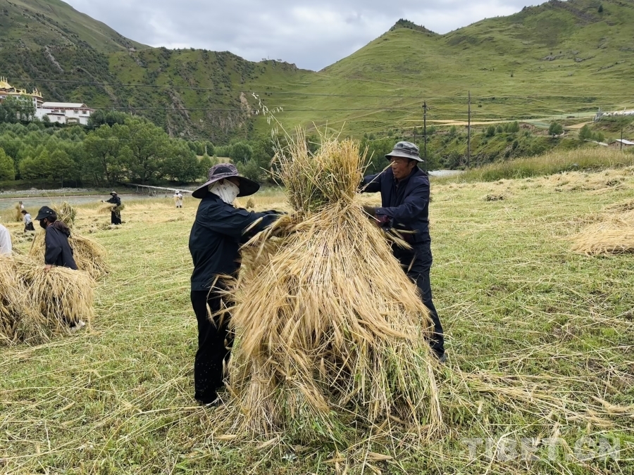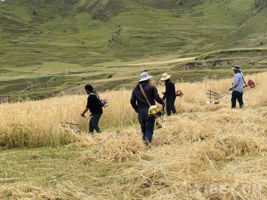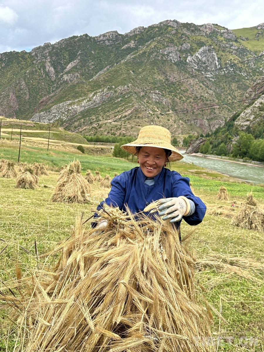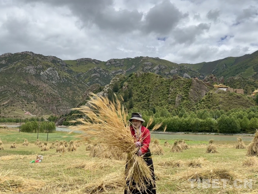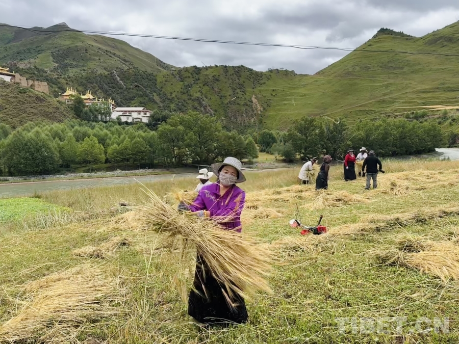 金穗低頭,豐收在望。孜榮村人們用勤勞的雙手繼續(xù)書寫著“高原糧倉”的豐收故事。(中國西藏網(wǎng) 記者/畢然 龍真多吉)