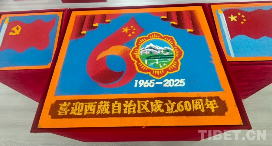 圖為孝登寺鑄牢中華民族共同體意識(shí)展覽館內(nèi),該寺僧人特別為西藏自治區(qū)成立60周年精心自制的沙畫