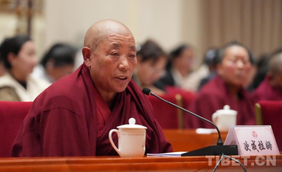 圖為拉薩市倉(cāng)姑寺寺管會(huì)副主任次成拉姆發(fā)言