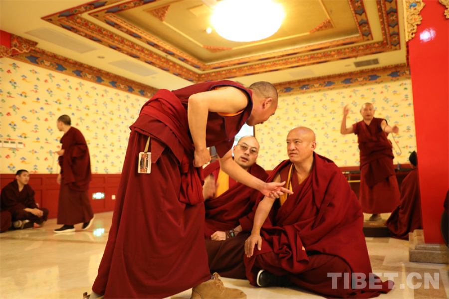圖為西藏佛學(xué)院學(xué)員與中國(guó)藏語(yǔ)系高級(jí)佛學(xué)院學(xué)員辯經(jīng)交流 攝影:王茜