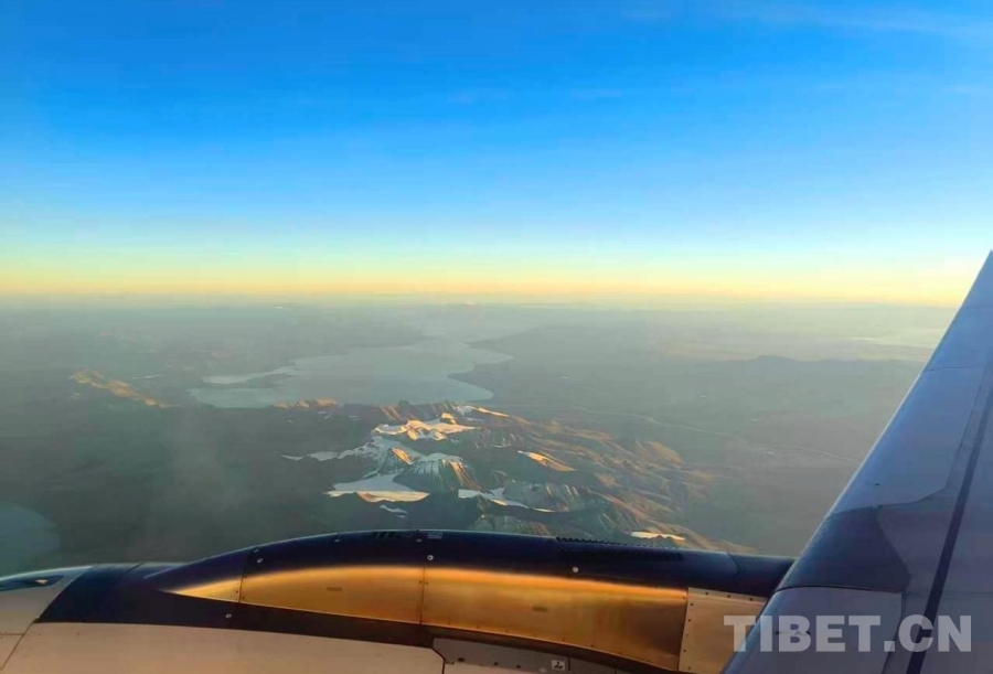 我們這次乘坐的航班飛往阿里兩個(gè)機(jī)場(chǎng)之一的昆莎機(jī)場(chǎng),從拉薩起飛的時(shí)間是早晨7點(diǎn)20。于是,在秋日有些涼的清晨,記者團(tuán)飛往阿里。在1個(gè)多小時(shí)的飛行中,阿里萬山之祖的氣勢(shì)漸次展開,一座又一座雪山仿佛手挽手跳著傳統(tǒng)宣舞的象雄儀仗隊(duì),迎接各方賓客。大川間有大湖,俯瞰去仿佛神女不小心落下的藍(lán)寶石,神秘珍貴。