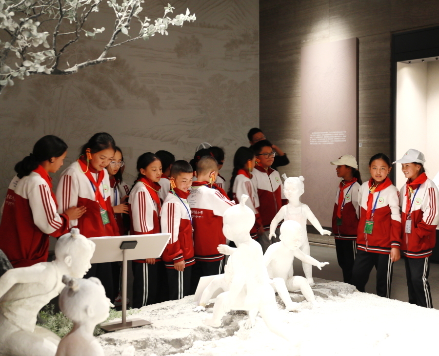 圖為《風(fēng)乎舞雩》群像塑像前,孩子們體悟千年前對(duì)于百姓富足、社會(huì)安定的理想追求 攝影:劉莉