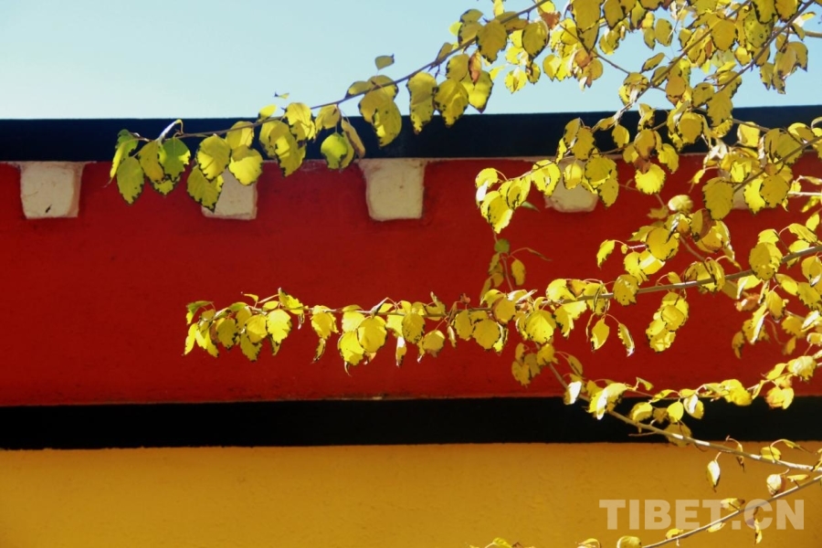 圖為阿里獅泉河鎮(zhèn),紅墻藍(lán)天黃葉相得映彰  攝影:趙釗