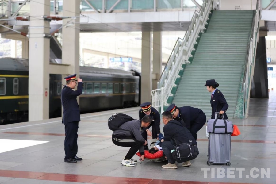 圖為拉薩火車站客運(yùn)值班員對(duì)特殊旅客提供特殊轉(zhuǎn)運(yùn)幫助