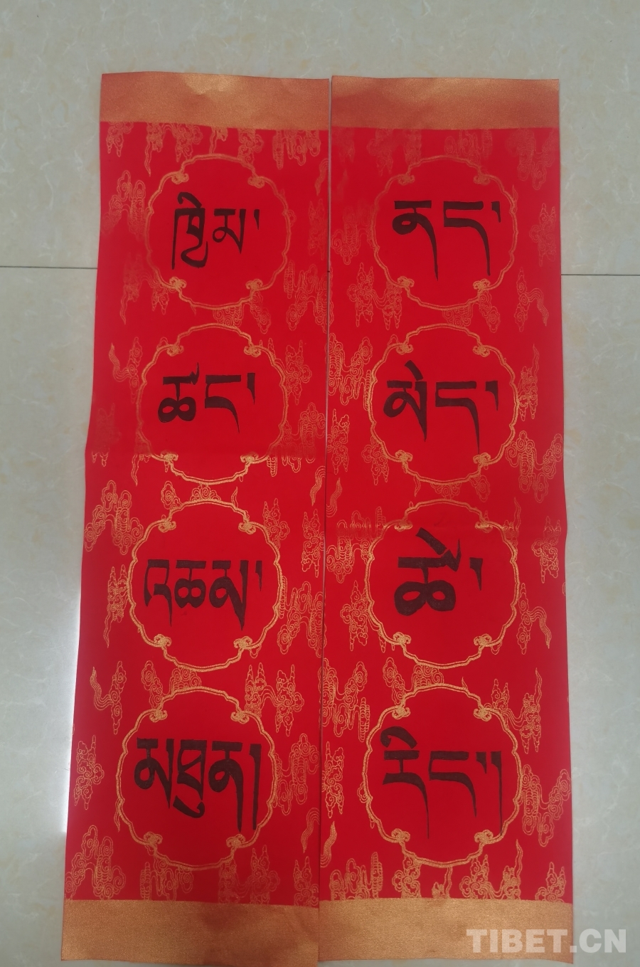 圖為李杰盛在春節(jié)期間為出行旅客撰寫(xiě)的藏文春聯(lián)