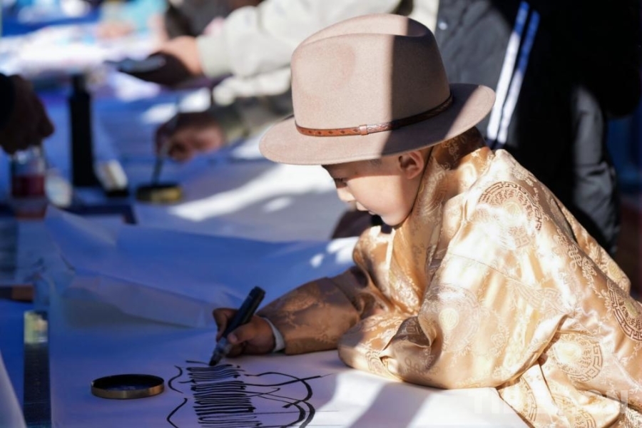 圖為參加匯報(bào)展的孩子在書(shū)寫(xiě)藏文 主辦方供圖