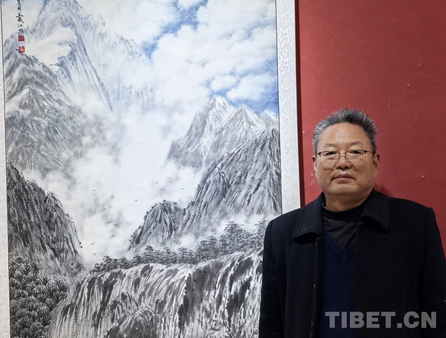 走進王藏江位于四川成都家中的畫室,碧空如洗、白云悠游、雪峰巍峨、峽谷深邃、布達拉宮聳立山巔……雄渾的高原風(fēng)情撲面而來,氣勢磅礴的國畫令人頓感胸襟開闊,仿佛置身高天厚土的西藏。
