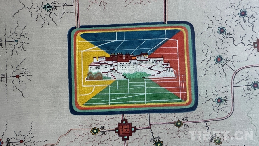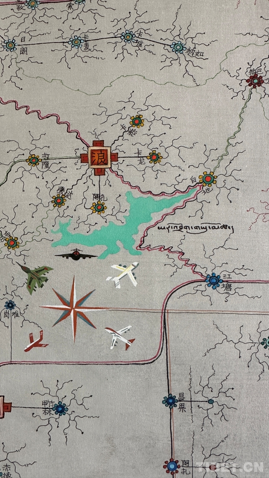 作為一件與地圖密切相關(guān)的作品,達(dá)布主要依據(jù)公路主線和國家公布的行政區(qū)域進(jìn)行描繪,對(duì)于一些在常用地圖上無法精確定位的地名,采取了審慎態(tài)度。達(dá)布還追溯了西藏的地圖繪制傳統(tǒng),認(rèn)為可以從著名的《西藏鎮(zhèn)魔圖》開始算起。然而,創(chuàng)作中的挑戰(zhàn)并沒有阻礙他的創(chuàng)作熱情?!爱嬛@幅畫,我覺得這是一個(gè)普通唐卡畫師用畫筆感恩當(dāng)下,是對(duì)歷史的真實(shí)記錄,對(duì)偉大工程成果的贊揚(yáng),也是對(duì)傳統(tǒng)唐卡表現(xiàn)形式的突破和思考。”