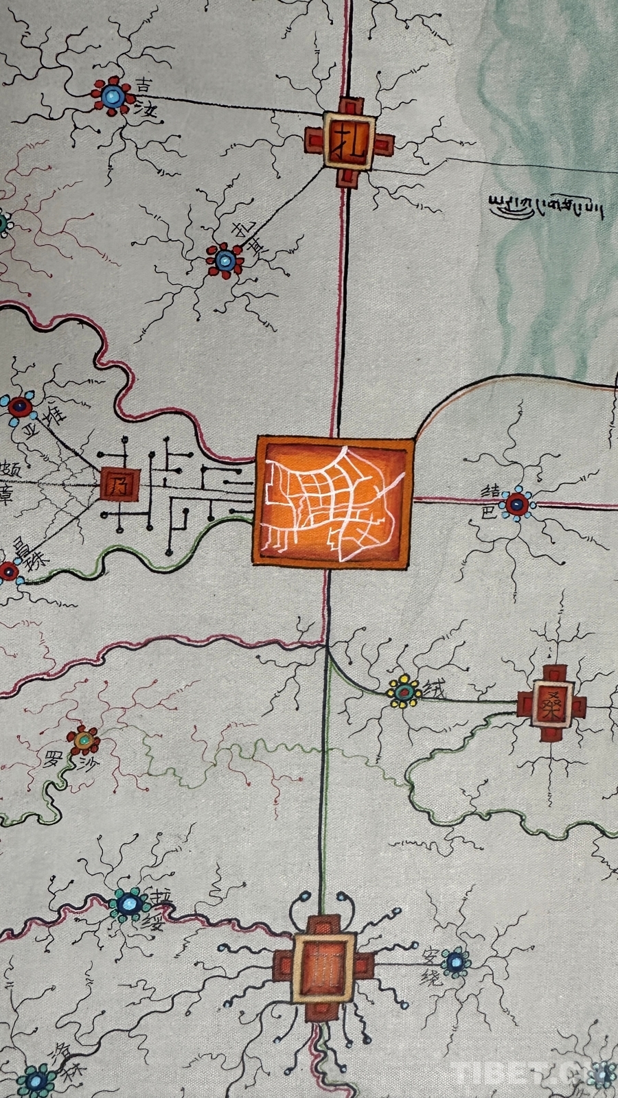 達(dá)布詳細(xì)解釋了這幅唐卡的圖像系統(tǒng):正方形代表市、區(qū),內(nèi)部畫有該市區(qū)主干道地圖;十字方形代表縣;圓形寶石形代表鄉(xiāng)鎮(zhèn);藏文“嗡”字代表名勝古跡;此唐卡以黑線為所有公路基礎(chǔ)線,黑線邊上的紅黃線代表國道和高速,綠線代表省道,黑細(xì)線代表縣鄉(xiāng)鎮(zhèn)及村級(jí)公路。沿途還繪制了珠峰、古格王國遺址、納木錯(cuò)等代表性景點(diǎn),并用藏文標(biāo)注名稱。