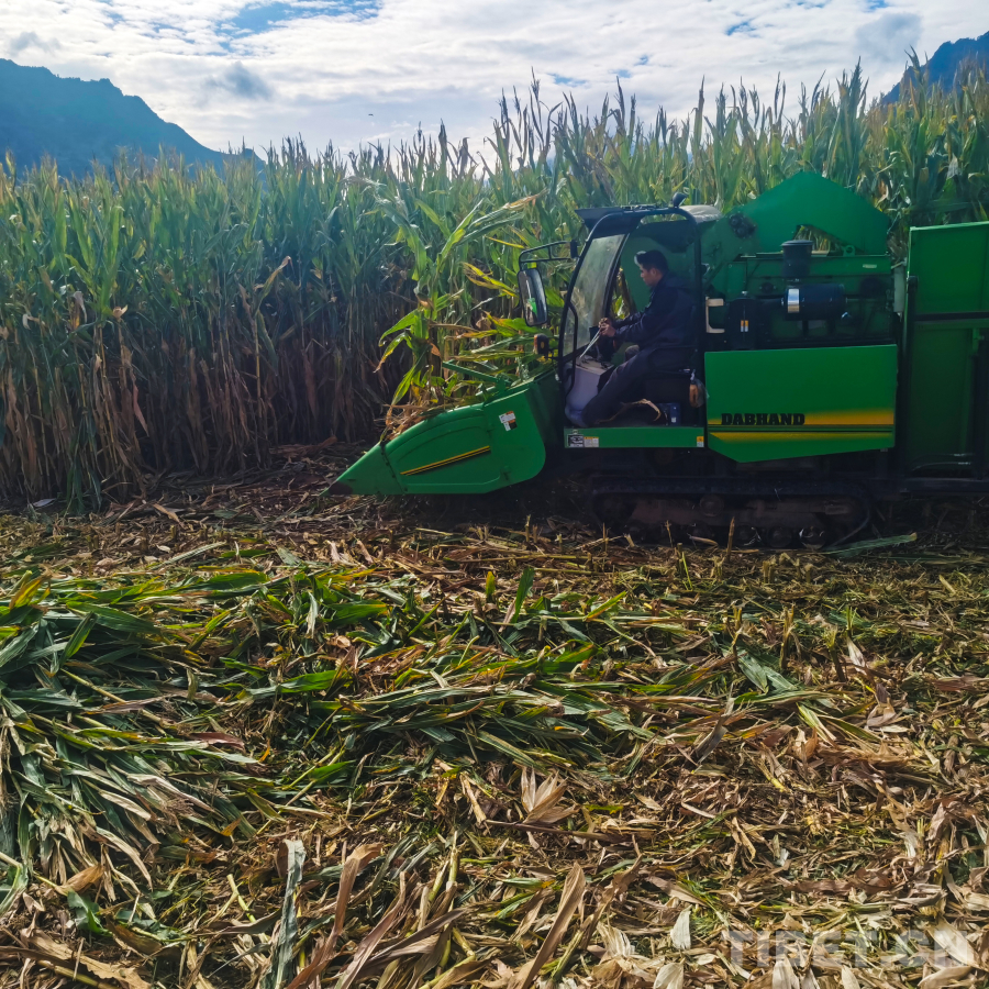 圖為工作人員在操作機(jī)器收割玉米
